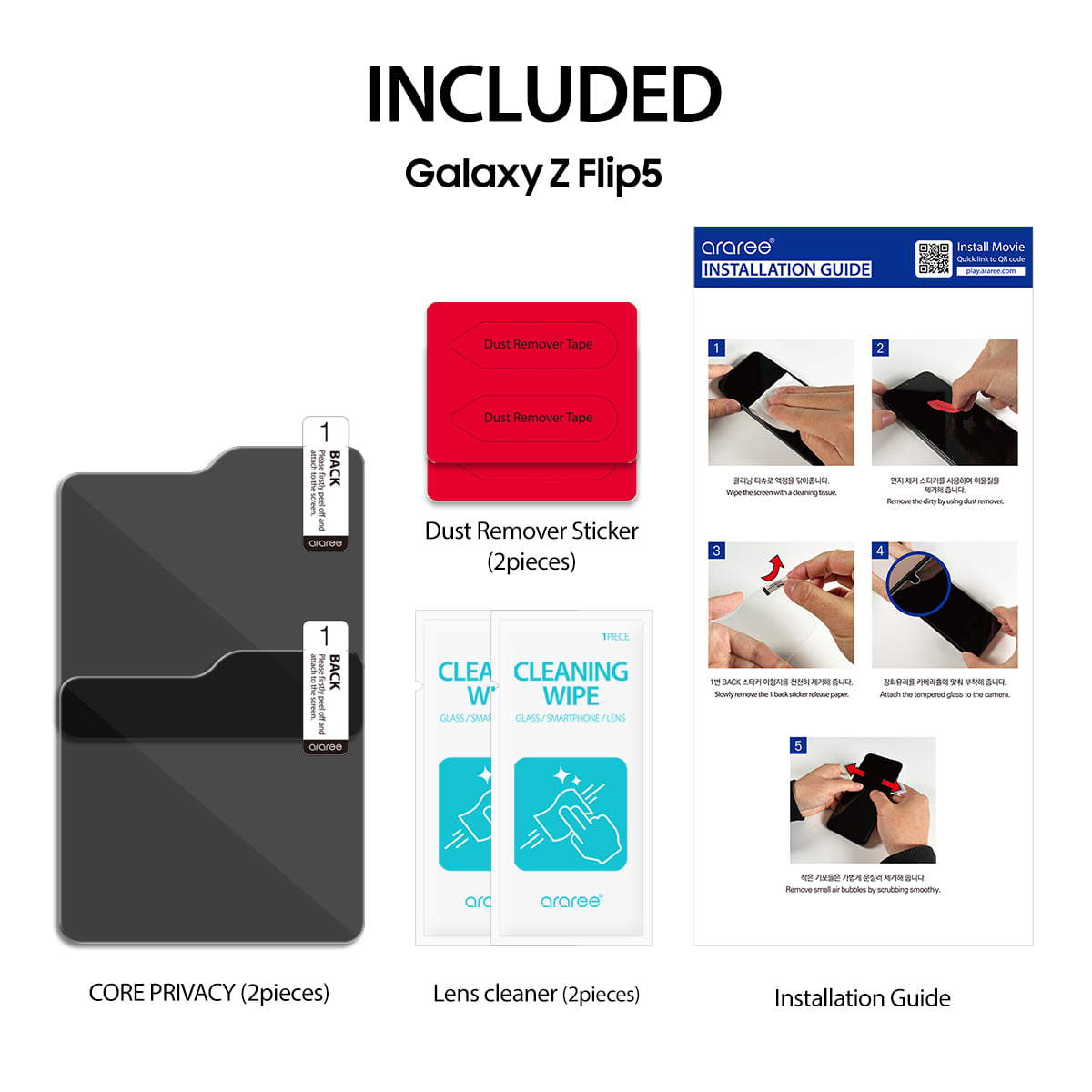 - Araree Core Front Tempered Glass Privacy กระจกนิรภัยชนิด Privacy ช่วยเพิ่มความเป็นส่วนตัวขณะใช้งานในที่สาธารณะ วัสดุกระจกคุณภาพดี ดีไซน์ไร้ขอบ ให้ความเรียบหรู สวยงาม ออกแบบมาสำหรับหน้าจอด้านนอกของ Samsung Galaxy Z Flip5