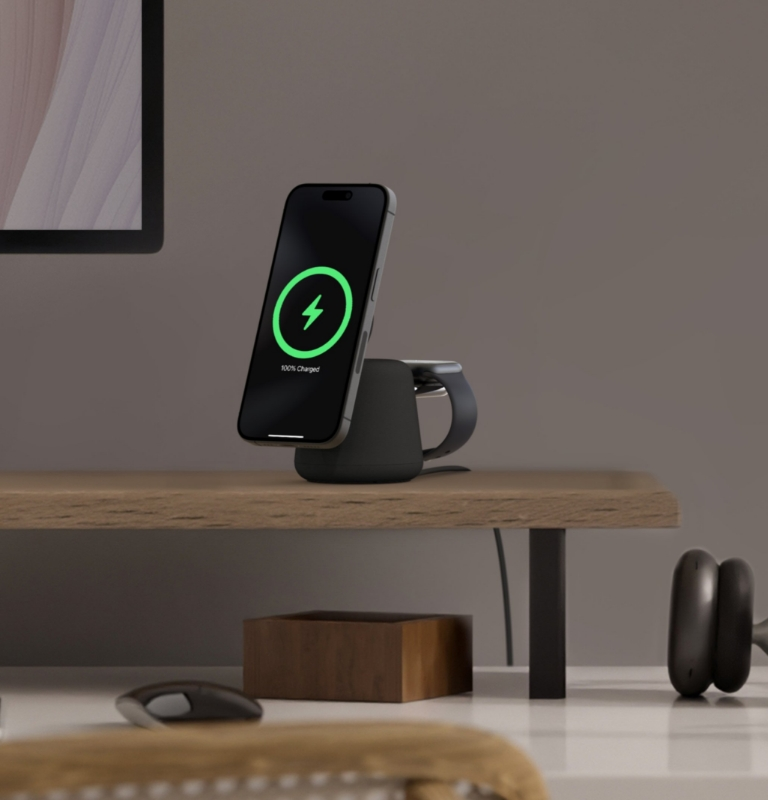 - BoostCharge Pro 2-in-1 Wireless Charging Dock with MagSafe 15W (WIZ020bt) แท่นชาร์จ MagSafe ดีไซน์แนวตั้งแบบ 2 in 1 จาก Belkin แบรนด์ผู้ผลิตอุปกรณ์เสริมชั้นนำจากสหรัฐอเมริกา (USA)