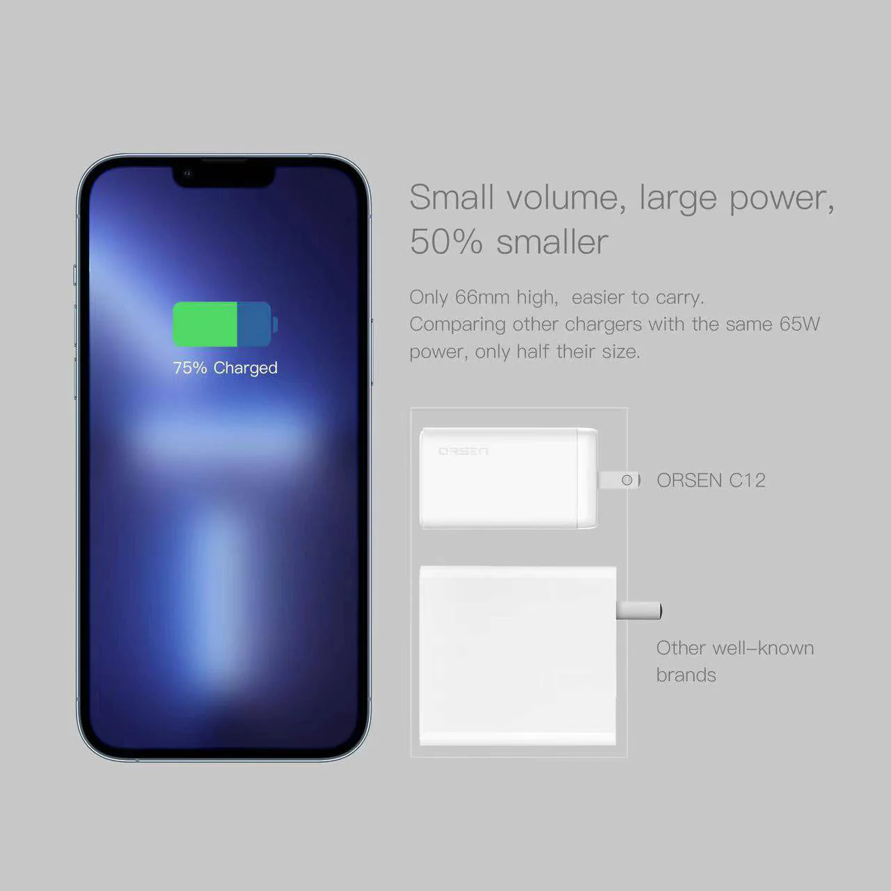 - Eloop C12 65W GaN (Orsen by Eloop) หัวชาร์จสำหรับ Smart Phone ที่มีความเร็วในการชาร์จแบตเตอรี่และประสิทธิภาพการทำงานสูงสุดที่ 65W
