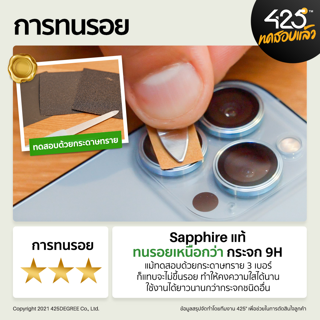 - วัสดุกระจกเป็น Sapphire แท้ 100% มีความแข็งแกร่งเป็นรองจากเพชรเพียงหนึ่งระดับเท่านั้น จึงทำให้เกิดรอยได้ยาก คงความใสได้ยาวนาน และกระจกมีความใสแบบ Ultra Clear จึงไม่ลดทอนคุณภาพของรูปถ่ายและการถ่ายวิดีโอก็ยังชัดแจ๋วเหมือนตอนไม่ติดกระจกเลนส์กล้องเลยครับ