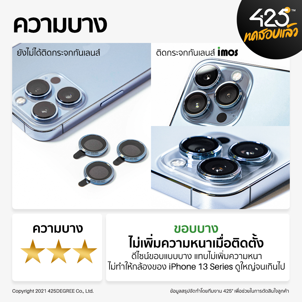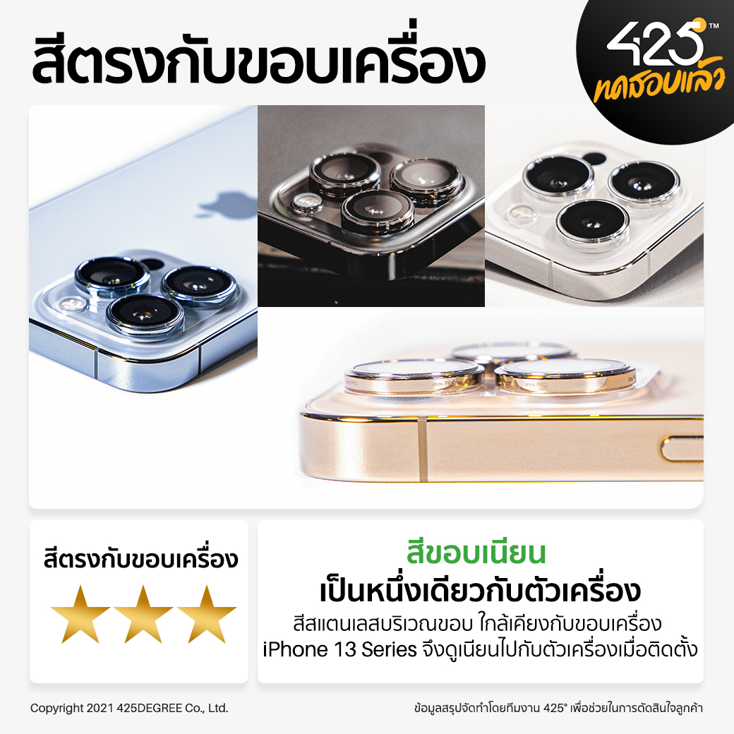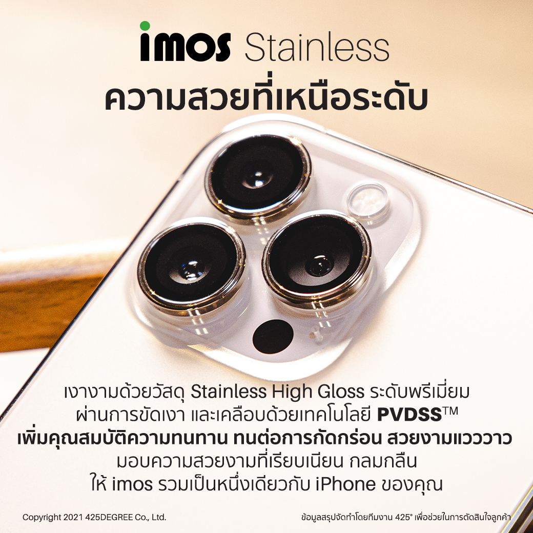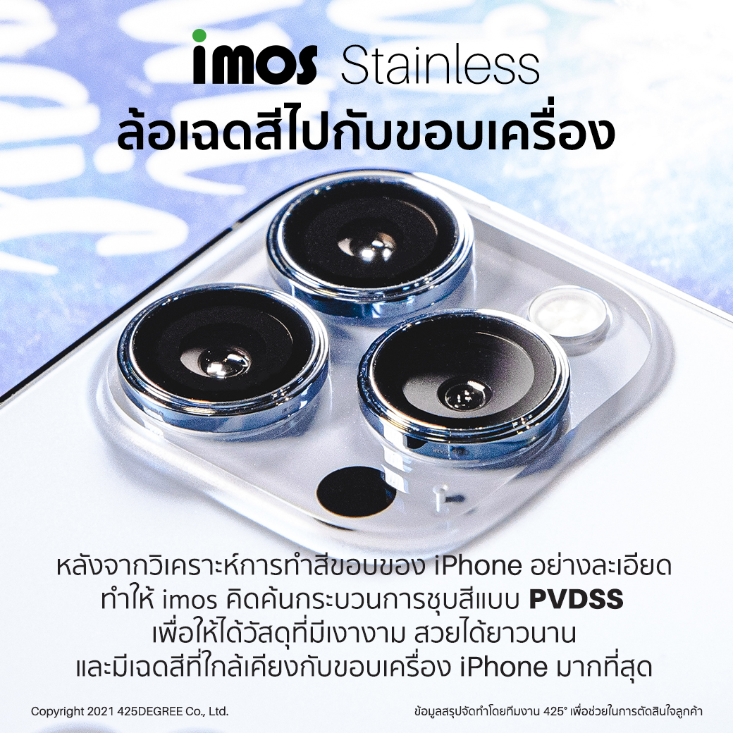 - วัสดุของกรอบเลนส์เป็น Stainless ผ่านขบวนการ PVDSS™ ของทางแบรนด์ imos ซึ่งเป็นการเคลือบสีโดยใช้สูญญากาศและไอออน ION ทำให้ได้ความเงาและเฉดสีที่ใกล้เคียงกับขอบตัวเครื่อง iPhone ทำให้เมื่อติดแล้วดูสวยเนียนไปกับตัวเครื่อง