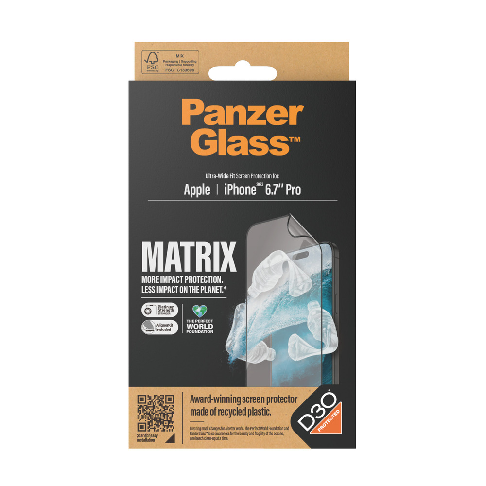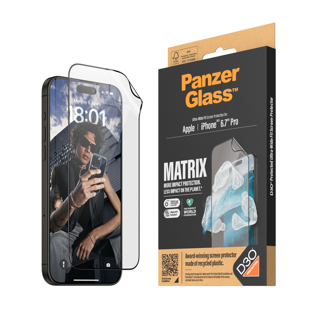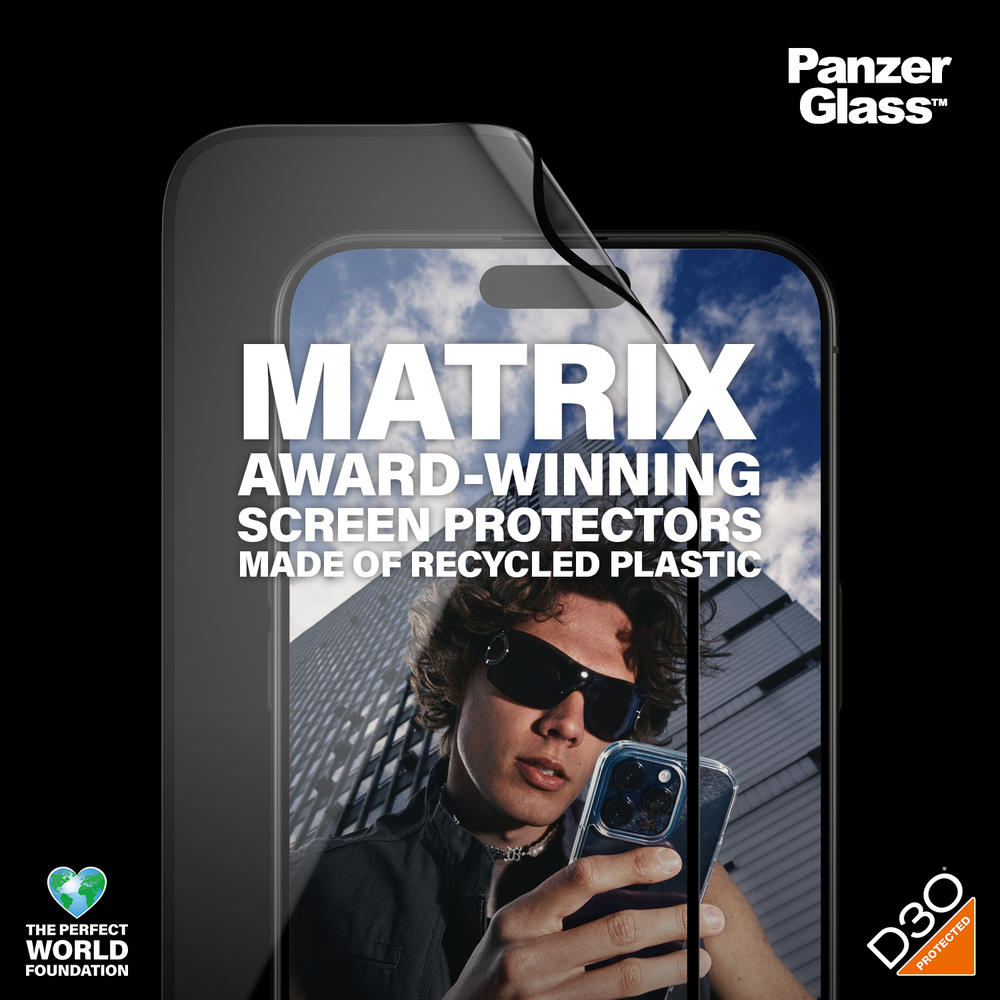 - PanzerGlass Ultra-Wide Fit Matrix with D3O เนื้อฟิล์มผลิตจากวัสดุ ผลิตจากวัสดุพลาสติกรีไซเคิล 100% (Made of 100% Recycled Plastic) ความแข็งแรงระดับกลาง Platinum Strength ช่วยปกป้องหน้าจอจากการกระแทกและรอยขีดข่วนได้