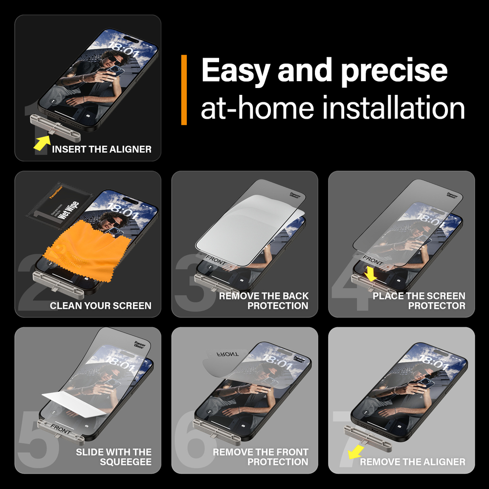 - Ultra-Wide Fit Matrix with D3O ฟิล์มพลาสติกกันรอยเต็มหน้าจอแบบใสขอบดำ สำหรับป้องกันหน้าจอ iPhone 15 Series จากแบรนด์พรีเมี่ยม PanzerGlass ประเทศเดนมาร์ก
