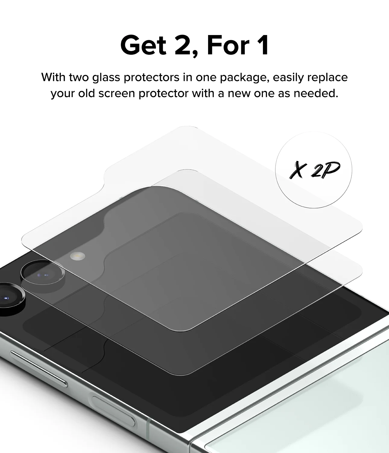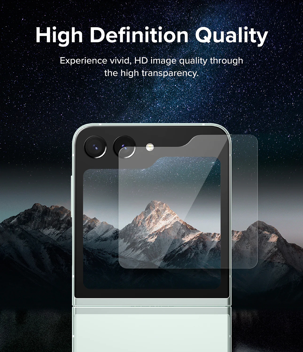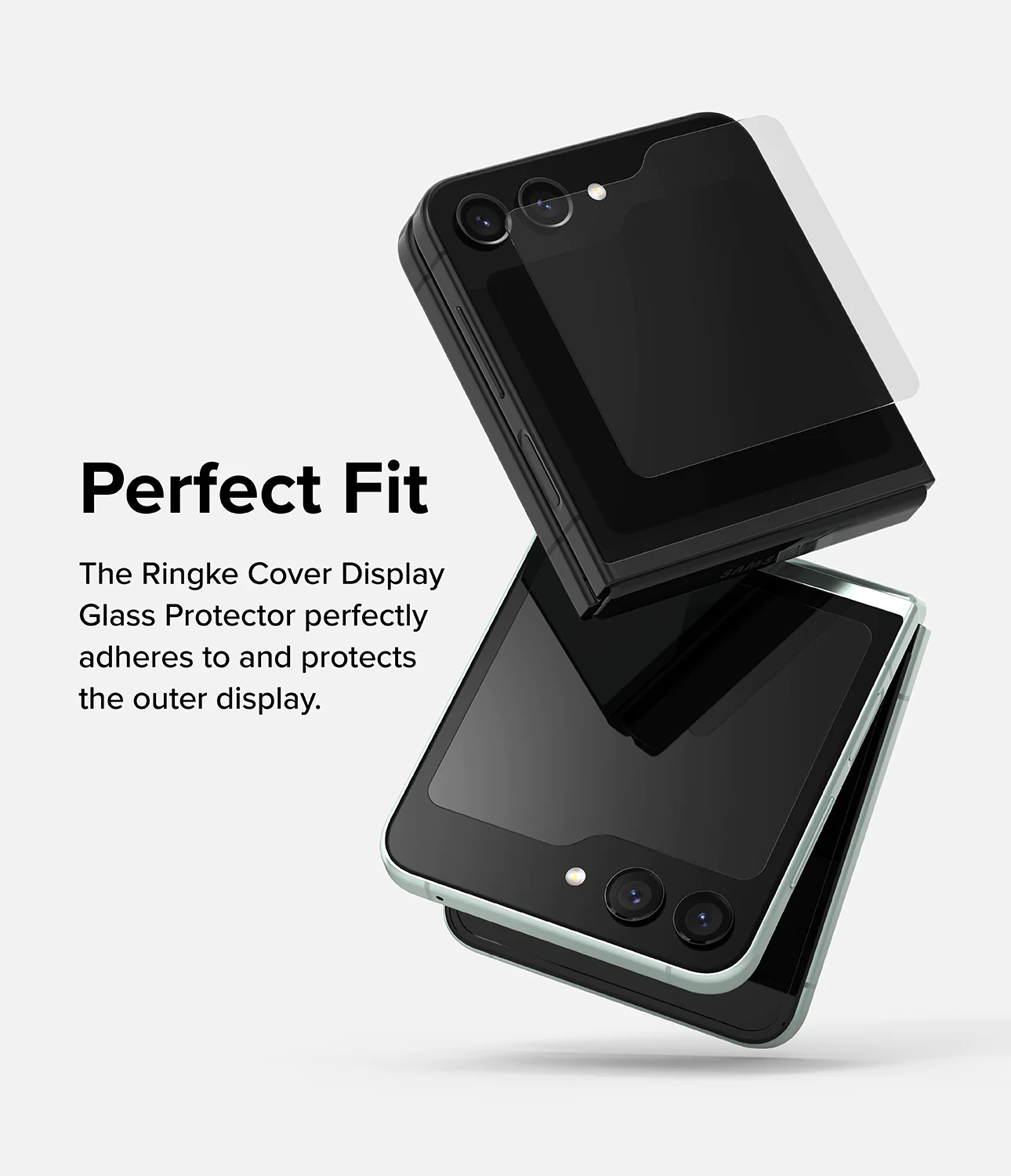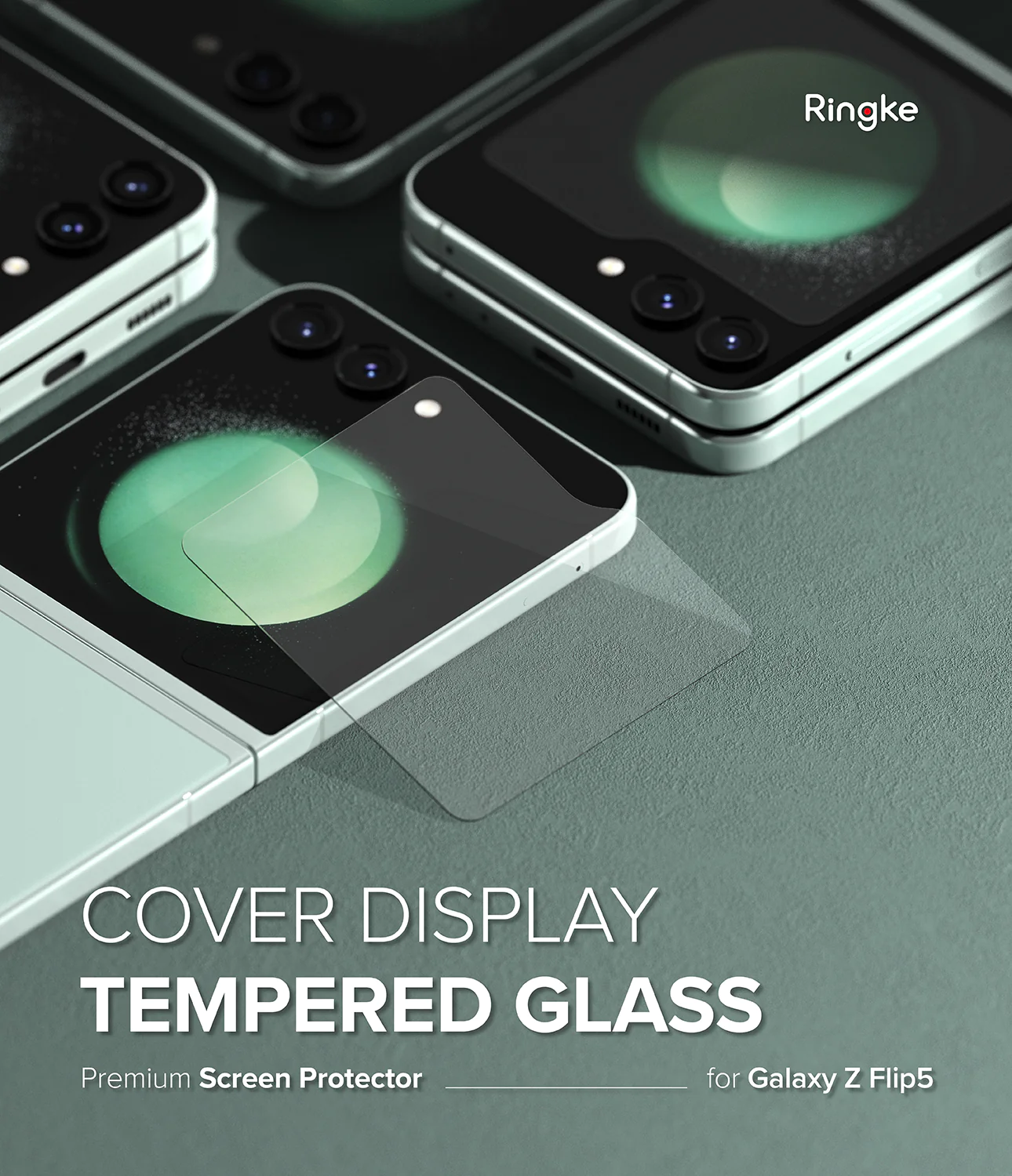 - Ringke Cover Display Protector Glass ฟิล์มกระจกนิรภัย สำหรับหน้าจอด้านนอก Galaxy Z Flip5 จำนวนสองแผ่น ช่วยให้ติดตั้งและใช้งานได้อย่างมั่นใจ