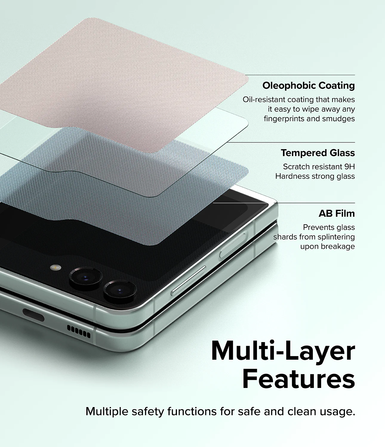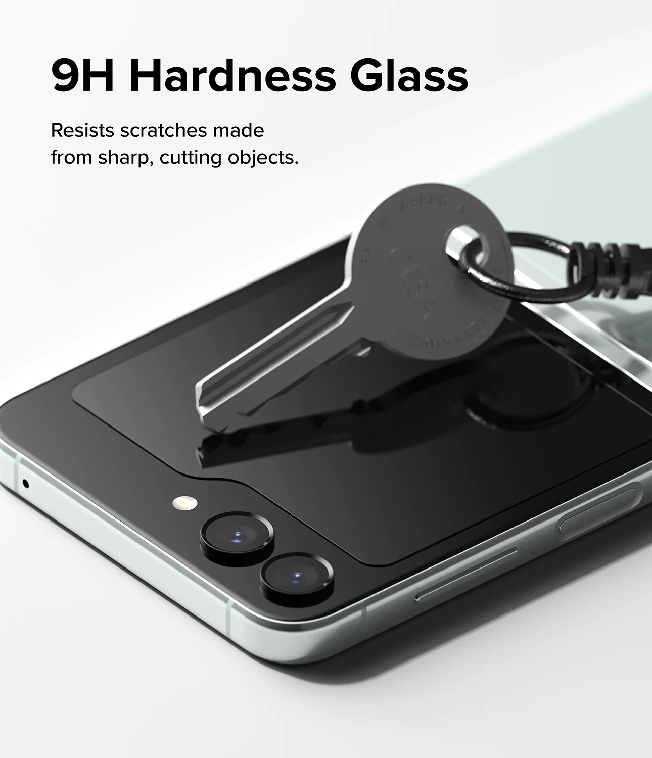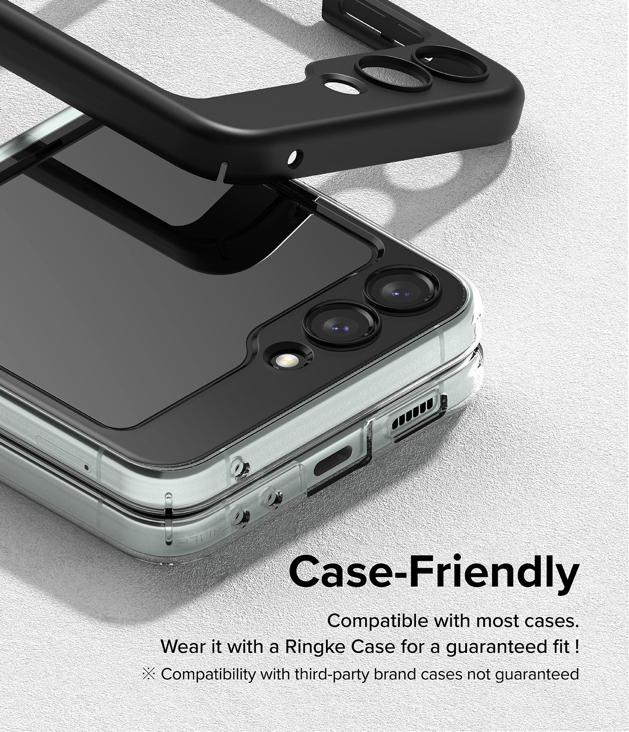 - Ringke Cover Display Protector Glass ฟิล์มกระจกนิรภัย สำหรับหน้าจอด้านนอก Galaxy Z Flip5 จำนวนสองแผ่น ช่วยให้ติดตั้งและใช้งานได้อย่างมั่นใจ