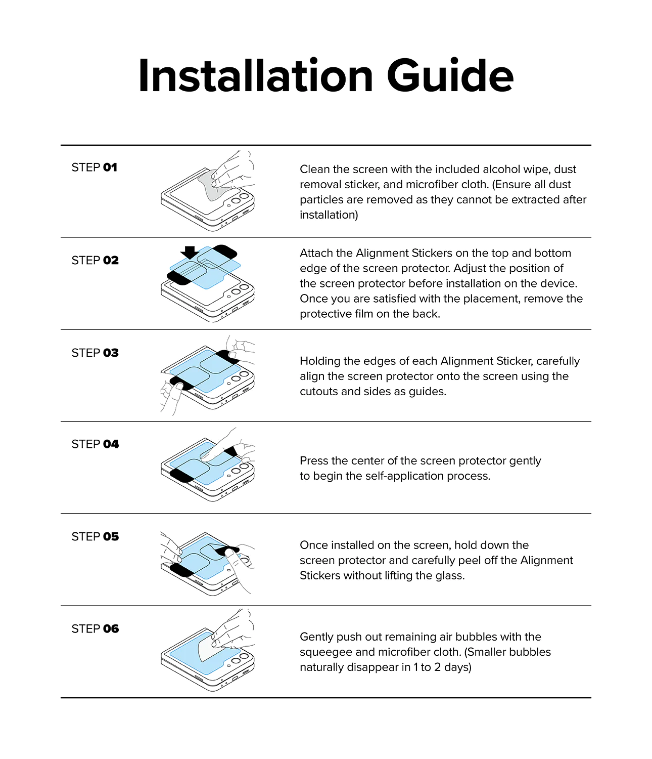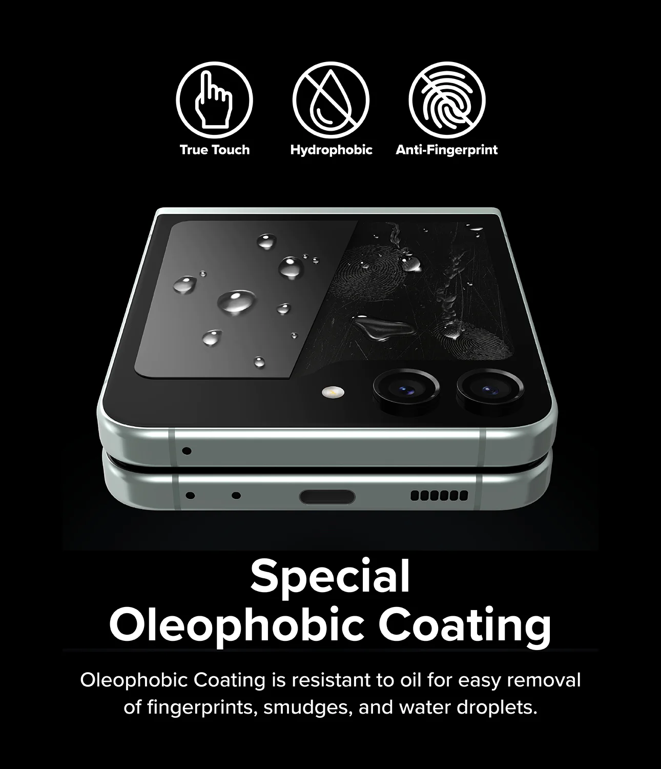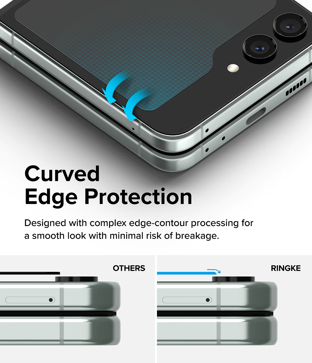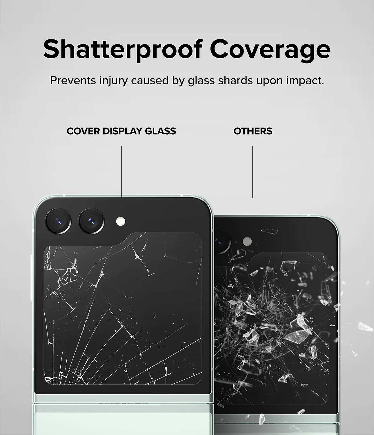 - Ringke Cover Display Protector Glass ฟิล์มกระจกนิรภัย สำหรับหน้าจอด้านนอก Galaxy Z Flip5 จำนวนสองแผ่น ช่วยให้ติดตั้งและใช้งานได้อย่างมั่นใจ