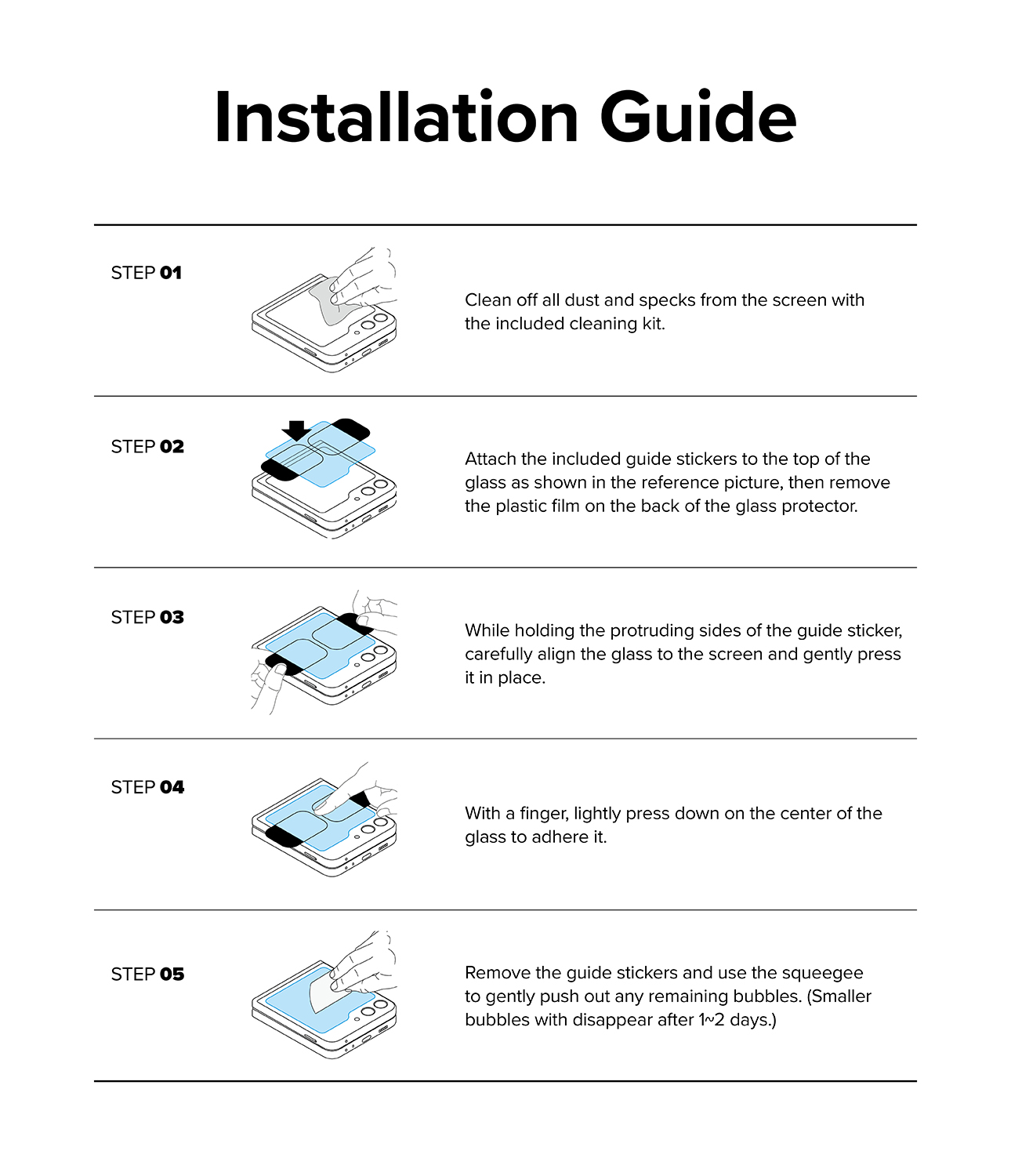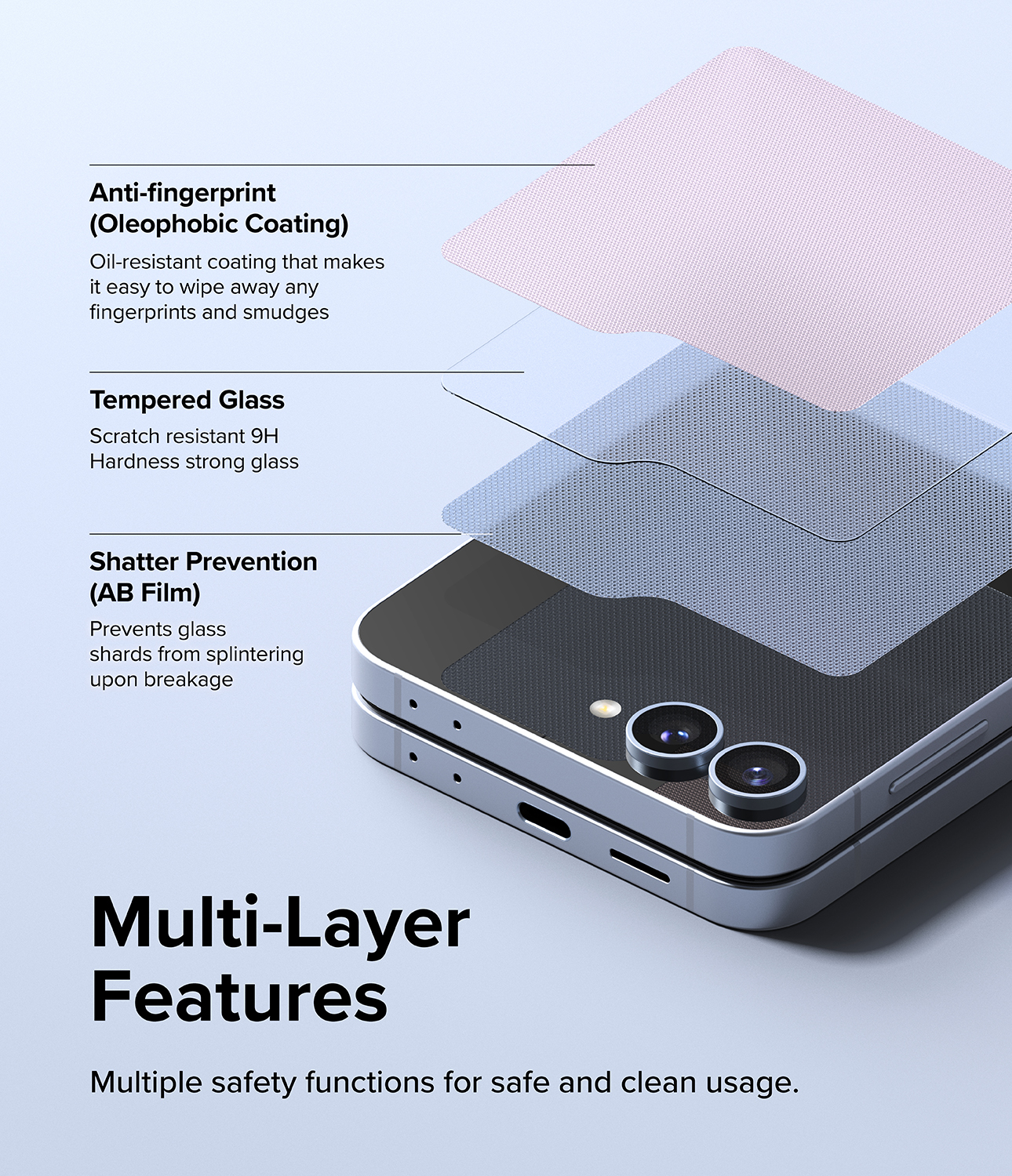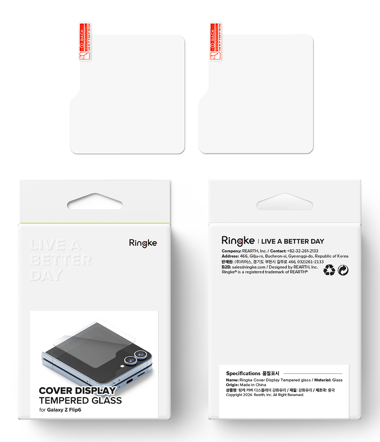 - Ringke Cover Display Protector Glass ฟิล์มกระจกนิรภัย สำหรับหน้าจอด้านนอก Galaxy Z Flip6 จำนวน 2 แผ่น ช่วยให้ติดตั้งและใช้งานได้อย่างมั่นใจ