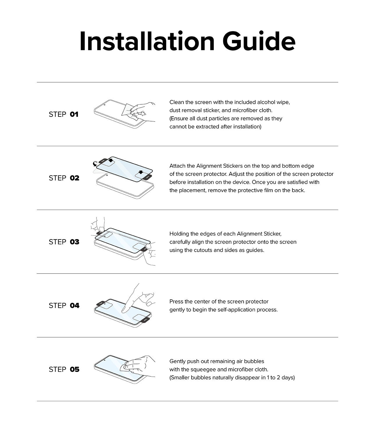 - หลังจากวางกระจกลงแนะนำให้ค่อยๆกดเบาไล่อากาศเริ่มจากตรงกลางจอออกไปจนครบทั่วทั้งหน้าจอแล้ว หากยังคงมีฟองอากาศเล็กๆอยู่ตามขอบให้ค่อยๆ ใช้ผ้าไมโครไฟเบอร์ไล่ฟองอากาศเล็กๆ ออกให้หมด ก็เป็นอันเสร็จสิ้น พร้อมใช้งาน