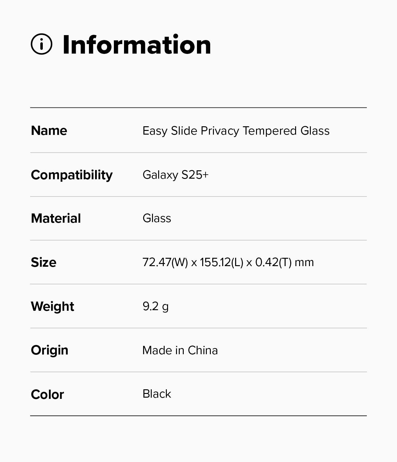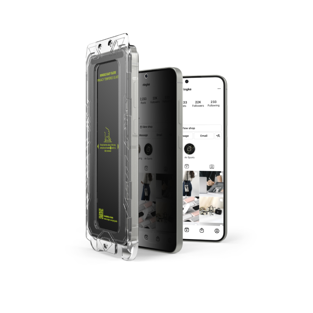 - Ringke Easy Slide Privacy Tempered Glass ฟิล์มกระจกนิรภัยกันรอยชนิดป้องกันการมองเห็นจากด้านข้าง จำนวน 2 แผ่น (2 Pack) สำหรับป้องกันหน้าจอของ Samsung Galaxy S25 Series