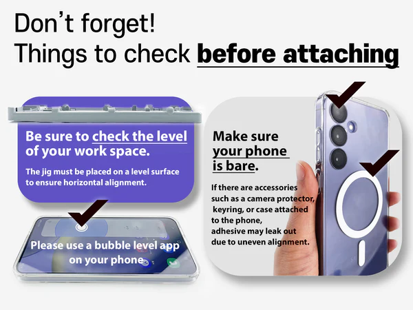 - ***ขณะติดตั้งฟิล์มกระจก ให้ถอดอุปกรณ์เสริมต่าง ๆ บน Smartphone ออกให้หมดก่อนนะครับ เช่น วงแหวน MagSafe เคส ฯลฯ เพื่อป้องกันอาการเครื่องเอียง,น้ำกาวไหลไม่ตรงหรือหกออกมาเลอะอุปกรณ์ต่าง ๆ ครับ