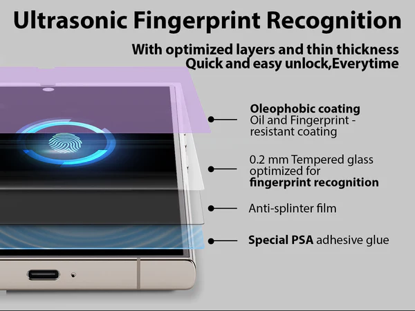 - ด้วยลักษณะพิเศษของกระจกแบบ UV ที่มีความบางและแนบสนิท ทำให้รองรับการสแกนลายนิ้วมือบนหน้าจอ (Ultrasonic Fingerprint Sensor) ได้อย่างลื่นไหล