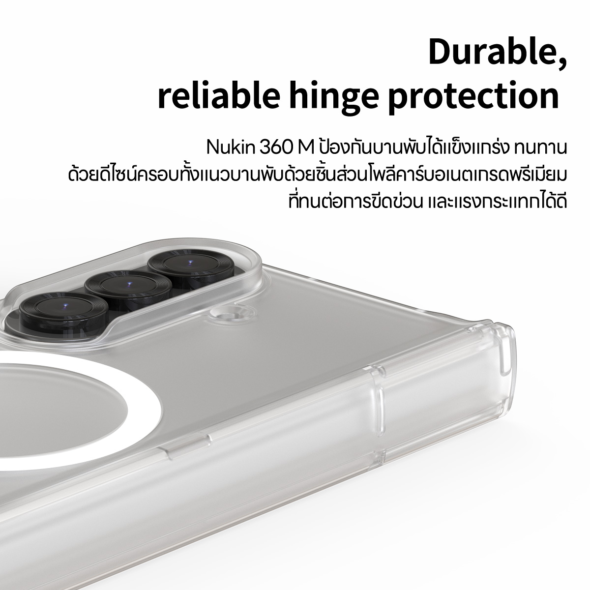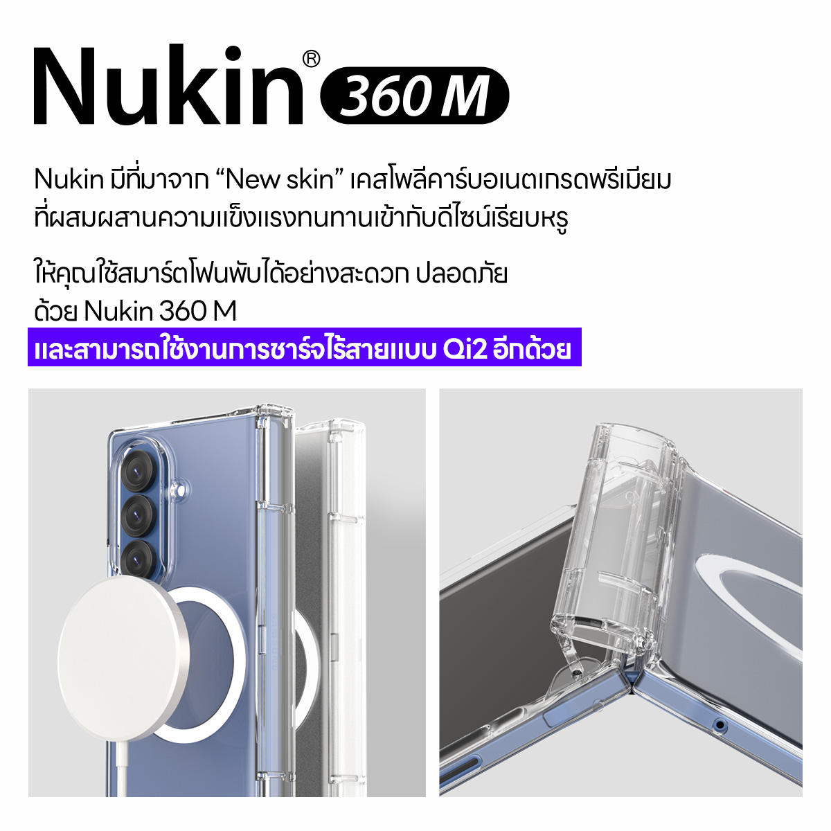 - Nukin 360 M ซีรีส์เคสใสที่เน้นความเบา มีความกระชับ และป้องกันรอยขีดข่วนได้ครบทุกมุม โดยมีชิ้นส่วนพิเศษป้องกันบริเวณบานพับ ทำให้ใช้งานได้อย่างสบายใจ