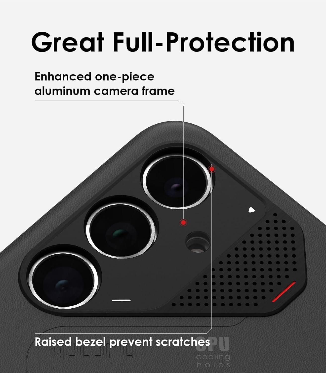 - ขอบเคสบริเวณเลนส์กล้องหนาเกินตัวเลนส์ขึ้นมาด้วยวัสดุแผ่นอลูมิเนียม (One-Piece Aluminum Plate) จึงช่วยป้องกันเลนส์ ไม่ให้สัมผัสโดยตรงกับพื้นผิววัสดุอื่น ๆ
