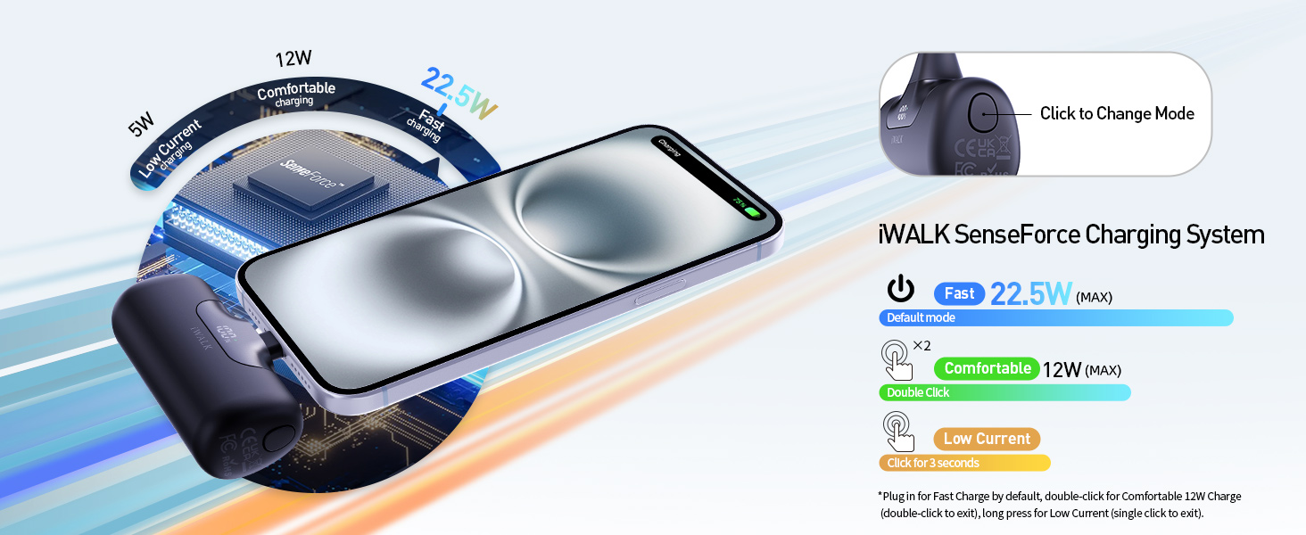 - มาพร้อมเทคโนโลยีใหม่ iWALK SenseForce Charging System ที่จะทำให้ผู้ใช้งานเลือกสลับโหมดการชาร์จได้ถึง 3 โหมด ที่ความเร็วตั้งแต่ 22.5W (Fast) / 12W (Comfortable) / 5W (Low Current) เพียงกดปุ่มด้านข้าง