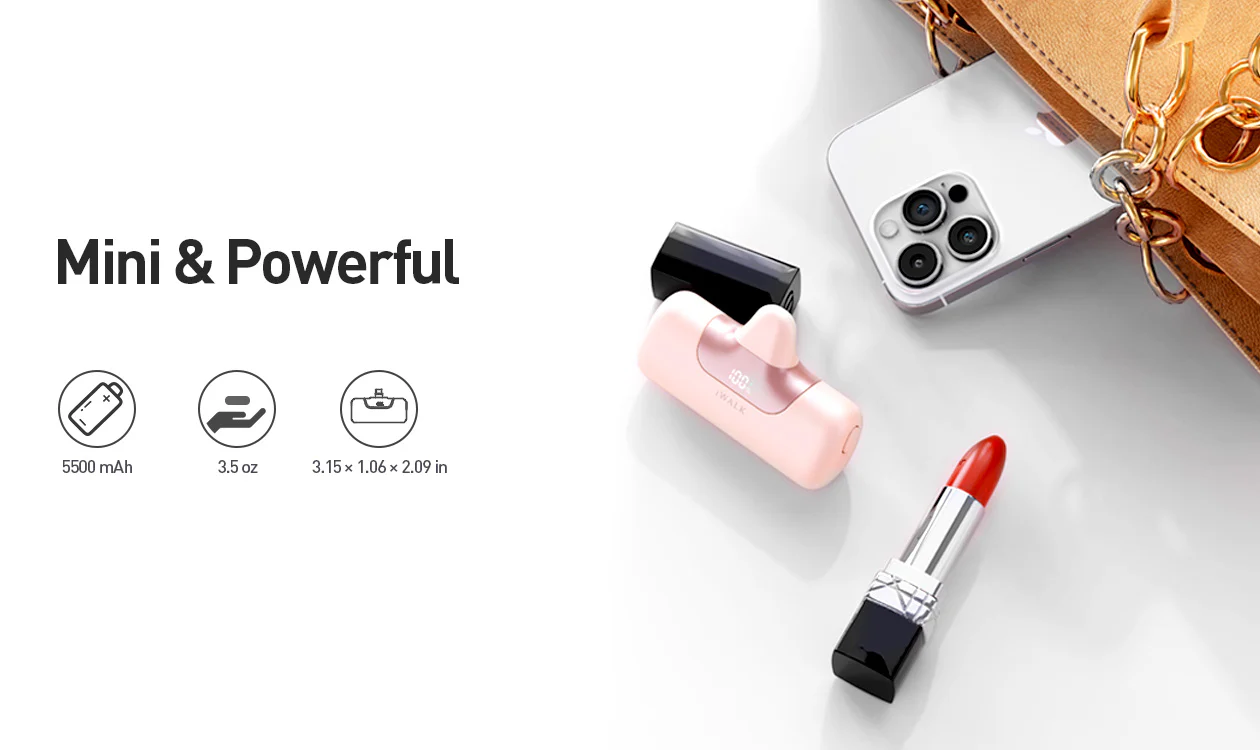 - ด้วยขนาดตัว Powerbank ที่มีด้านยาวสูงสุดเพียง 8 cm ขนาดใกล้เคียงแท่งลิปสติก พร้อมจุกปิดคลุมขั้วเสียบ ทำให้สามารถพกพาได้อย่างสะดวกและปลอดภัย