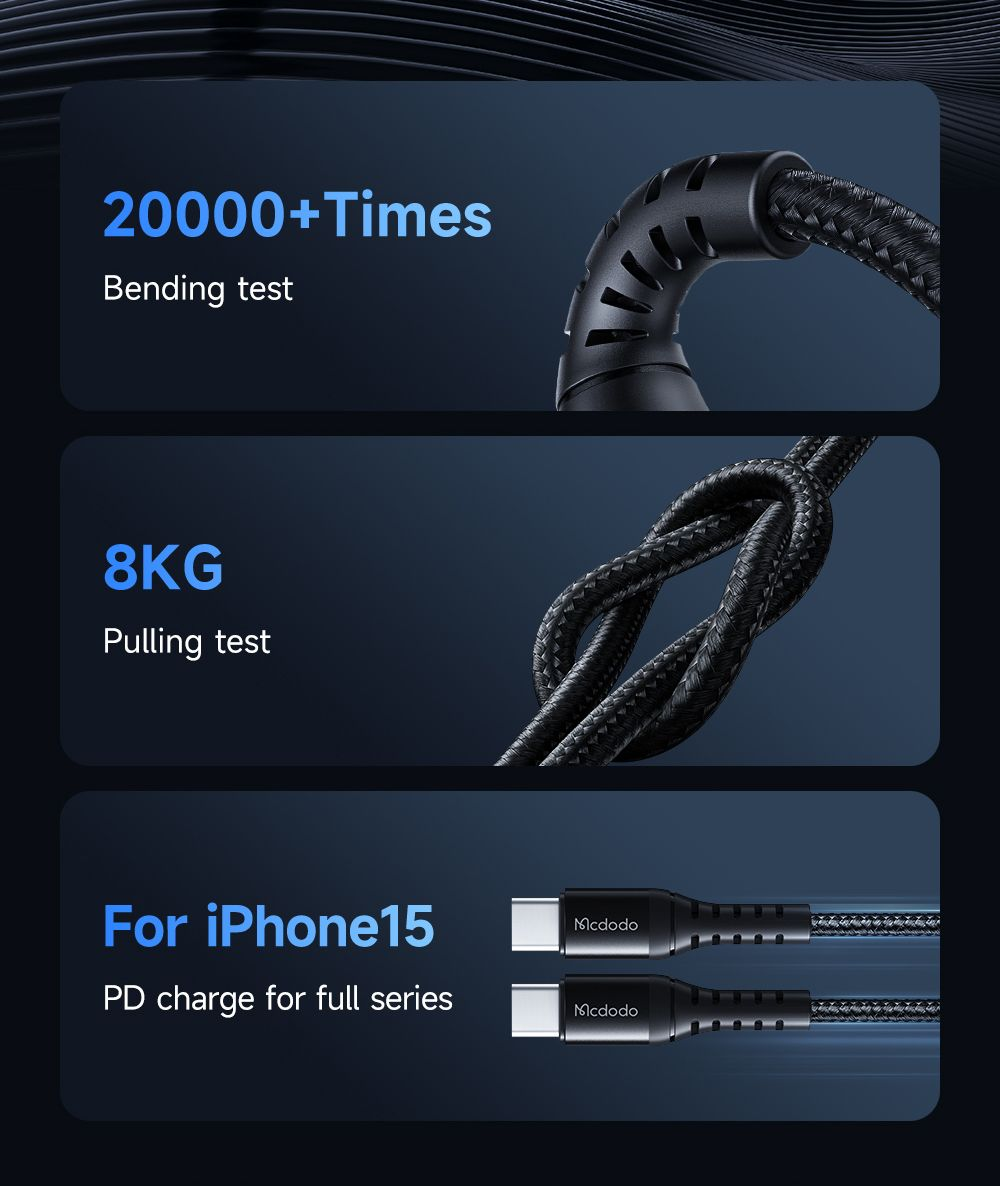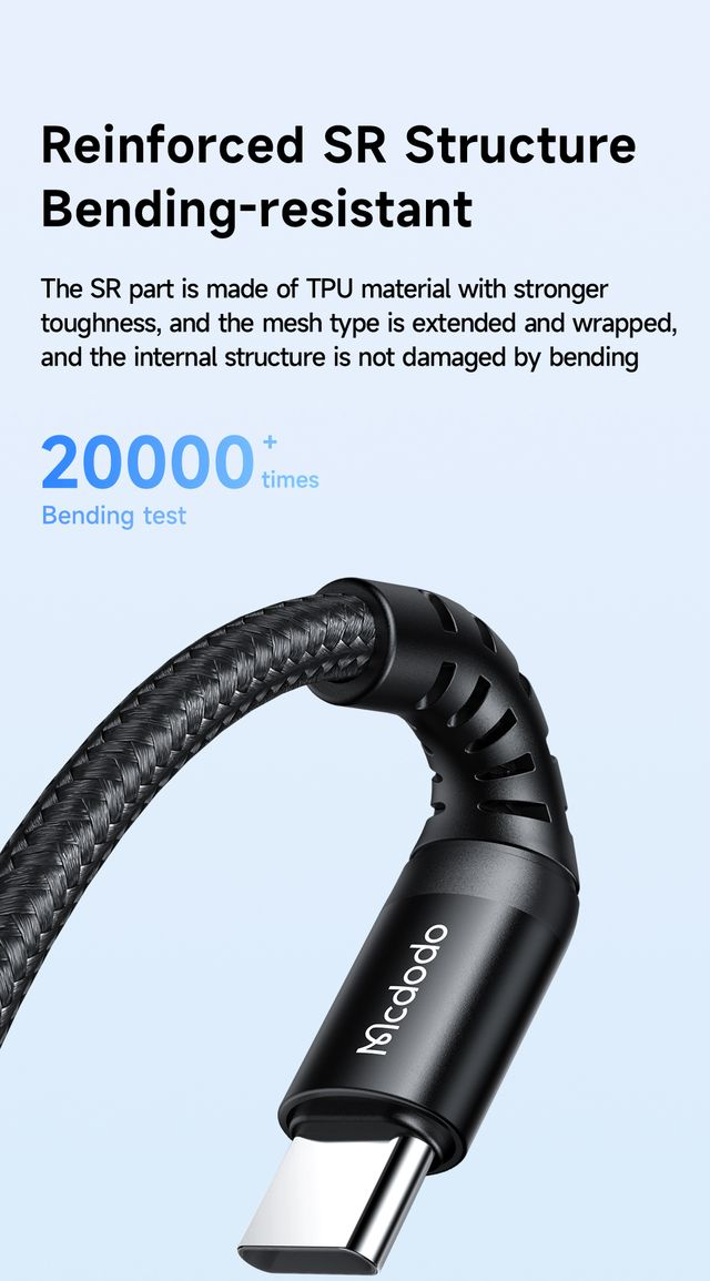 - ผ่านการทดสอบจาก Lab ภายในของ Mcdodo มั่นใจได้ว่าตัวสายมีความทนทานต่อการหักงอมากกว่า 20,000+ ครั้ง และทนแรงดึงกว่า 8 กิโลกรัม