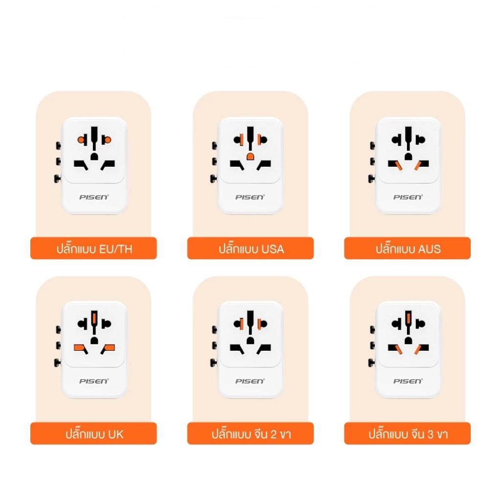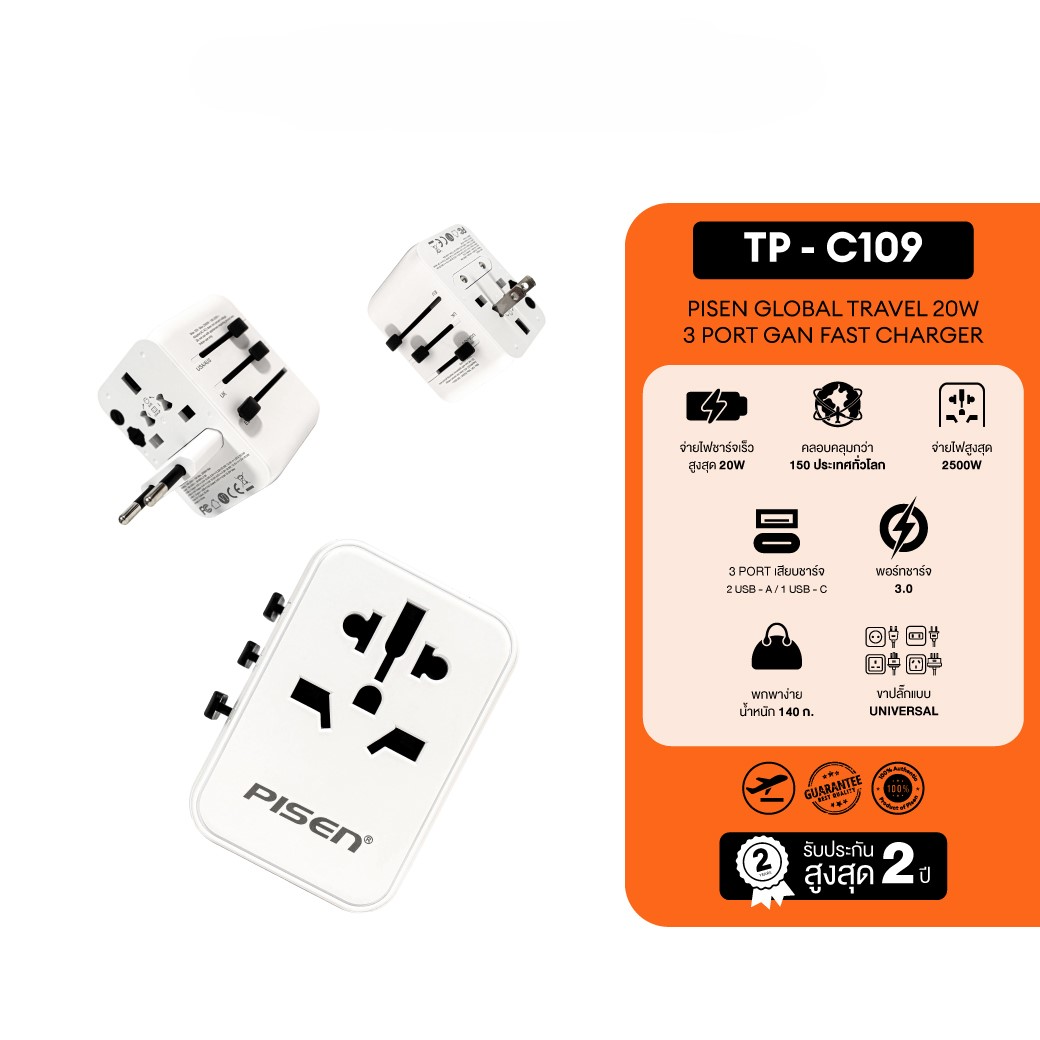 - PISEN Global Travel 20W 3 Port GaN Fast Charger (TP-C109) หัวชาร์จแบบ Travel Adapter สำหรับคนเดินทางบ่อย รองรับการใช้งานกว่า 150 ประเทศทั่วโลก พร้อมเทคโนโลยี GaN ภายใน