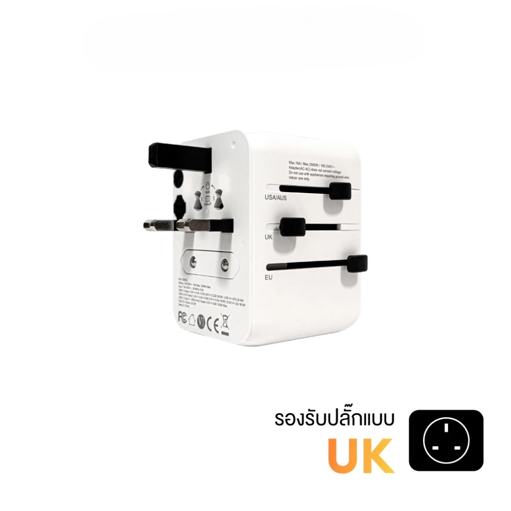 - มีขาปลั๊ก 4 แบบ (US / AU / UK / EU) ในตัว พร้อมเต้ารับแบบ Universal ที่สามารถใช้งานกับเครื่องใช้ไฟฟ้าที่กินกระแสไม่เกิน 10A (2500W Max) ได้อย่างมั่นใจ