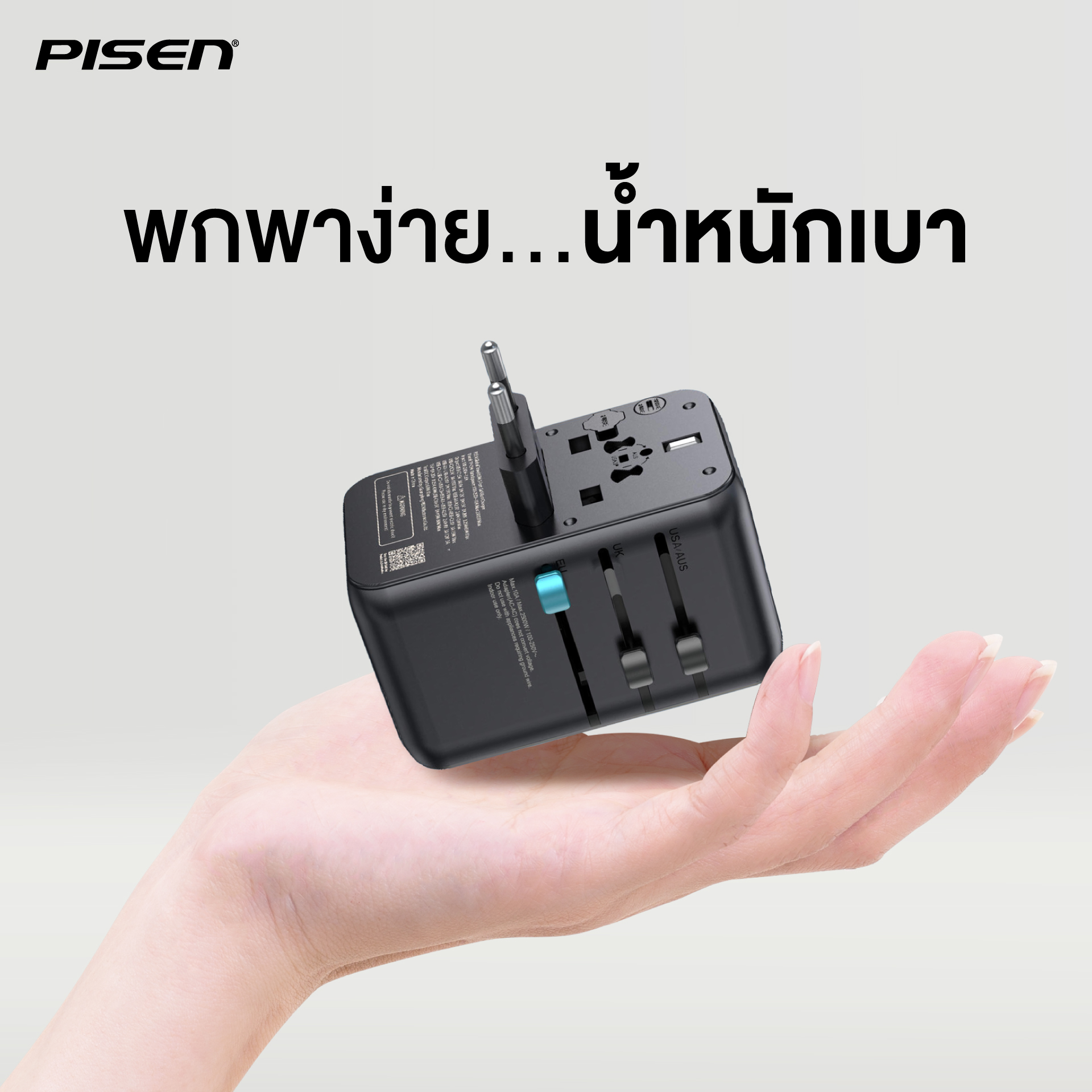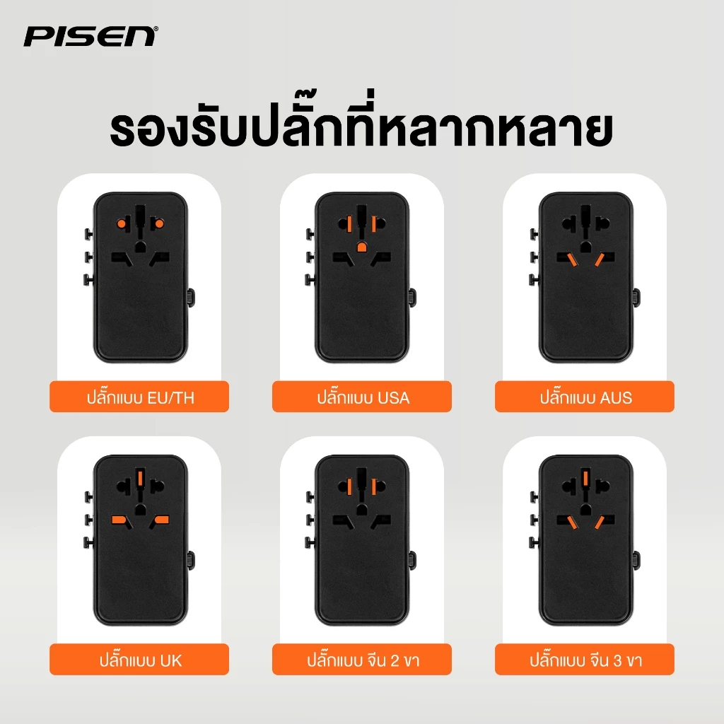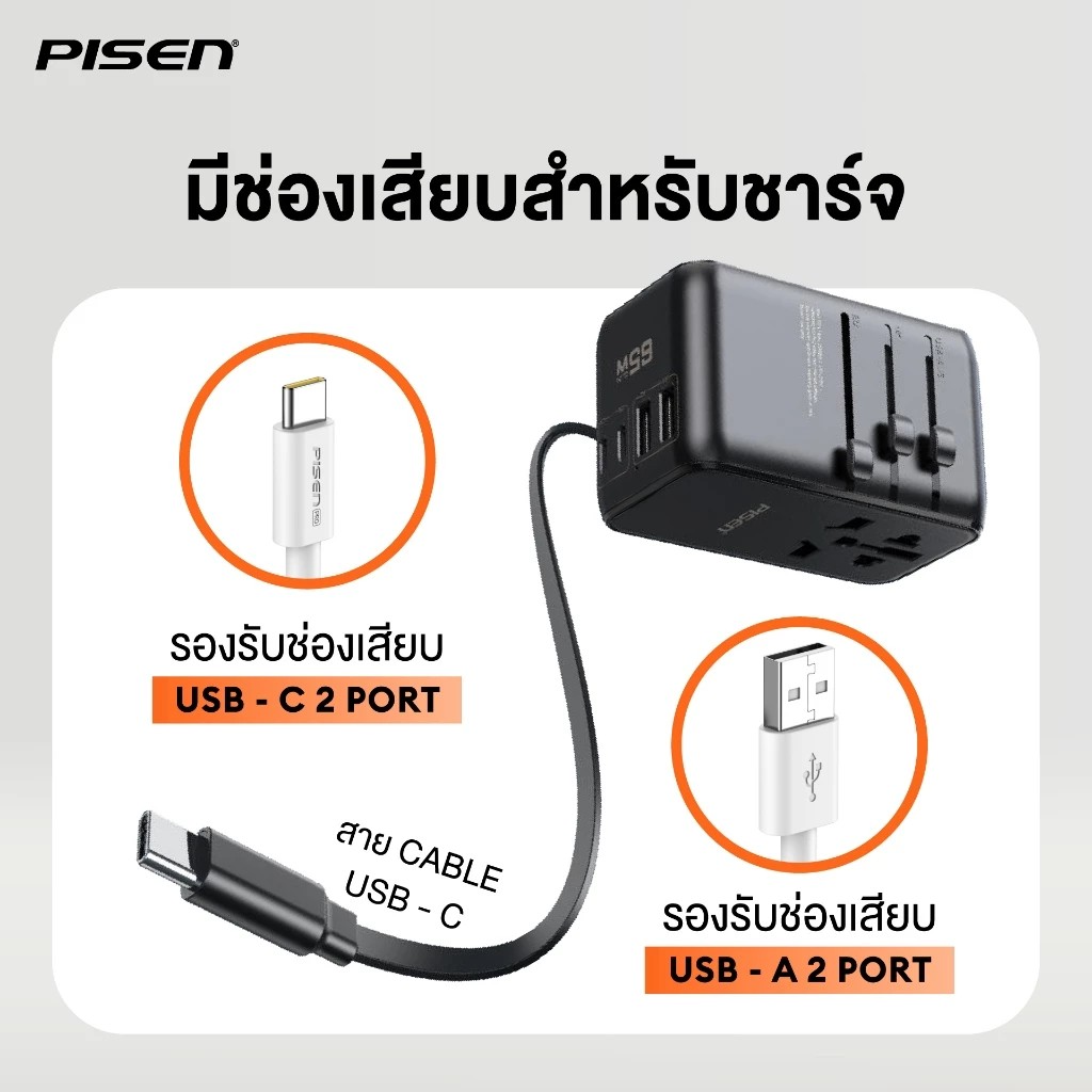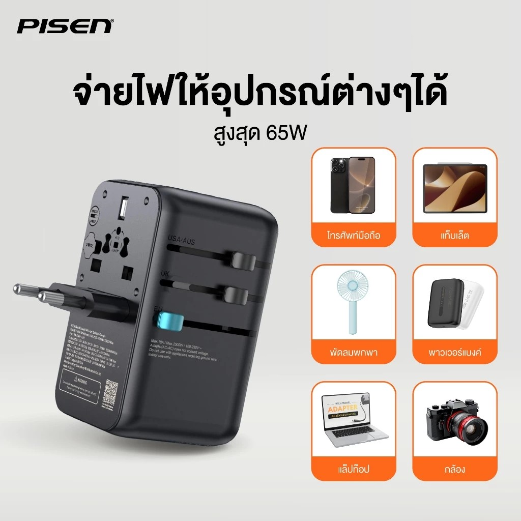 - PISEN Global Travel 65W 5 Port GaN Fast Charger (TP-C94) หัวชาร์จแบบ Travel Adapter สำหรับคนเดินทางบ่อย รองรับการใช้งานกว่า 150 ประเทศทั่วโลก พร้อมเทคโนโลยี GaN ภายใน