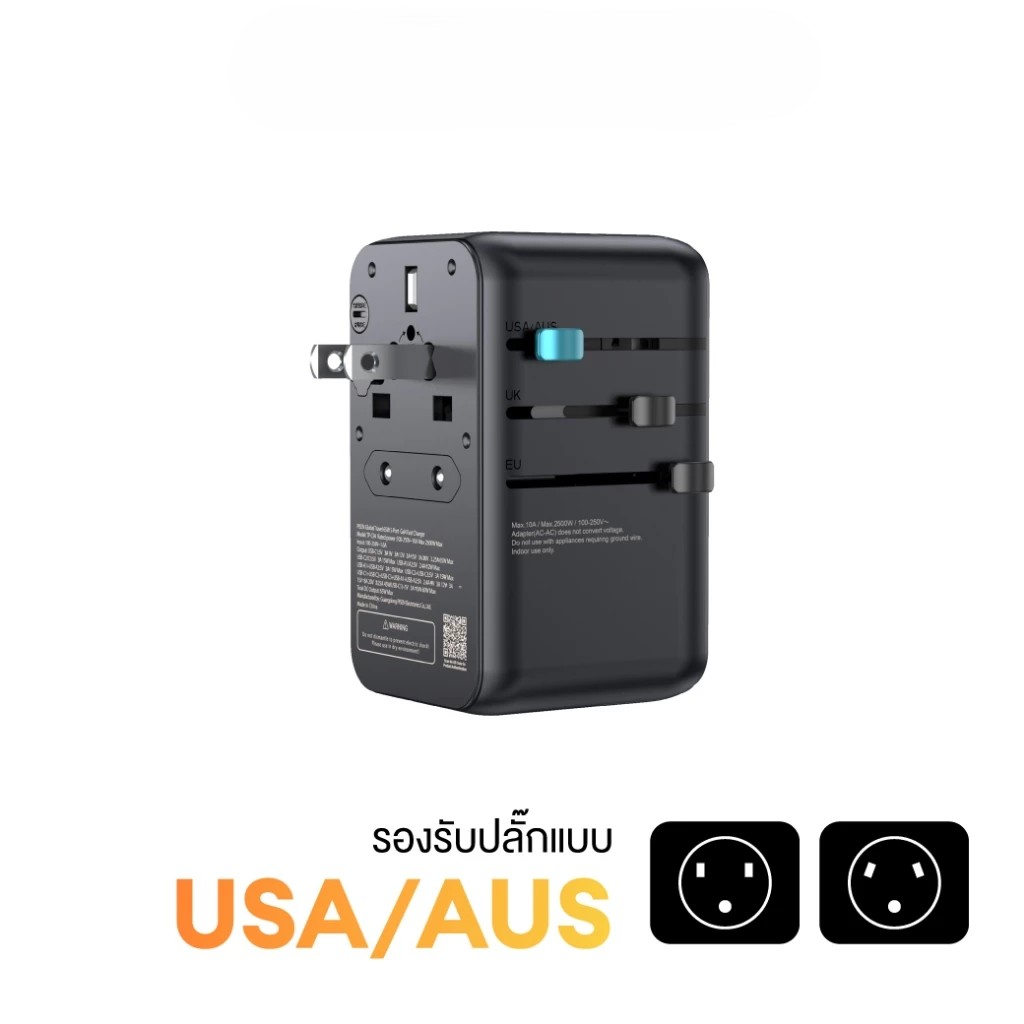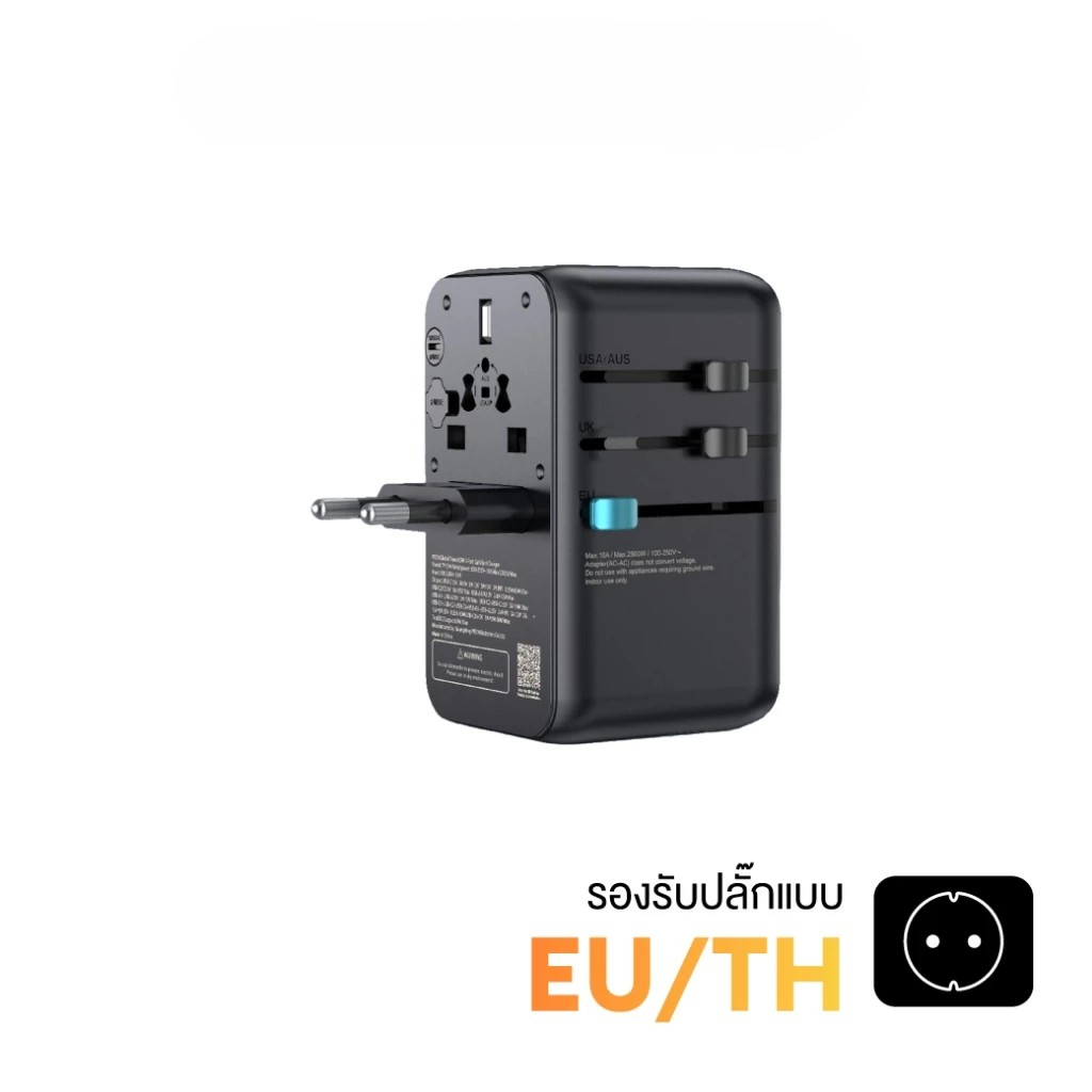 - นอกจากช่องเสียบ USB-C และ USB-A แล้ว ยังมีเต้ารับแบบ Universal ที่สามารถใช้งานกับเครื่องใช้ไฟฟ้าที่กินกระแสไม่เกิน 10A (2500W Max) ได้อย่างมั่นใจ **แต่แรงดันไฟฟ้าที่อุปกรณ์รับได้ต้องตรงกับแรงดันไฟฟ้าที่จ่ายออกมา เพราะ Travel Adapter ตัวนี้ ไม่สามารถแปลงแรงดันไฟฟ้าได้