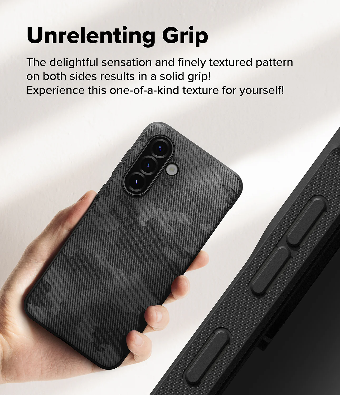 - ขอบด้านข้างเคสถูกออกแบบให้มีลักษณะเป็น Grip ยางพื้นผิวลายจุด (Microdot Pattern Texture) จึงทำให้จับง่ายถนัดมือ และรู้สึกได้ถึงความกระชับ ไม่ลื่นหลุดมือ