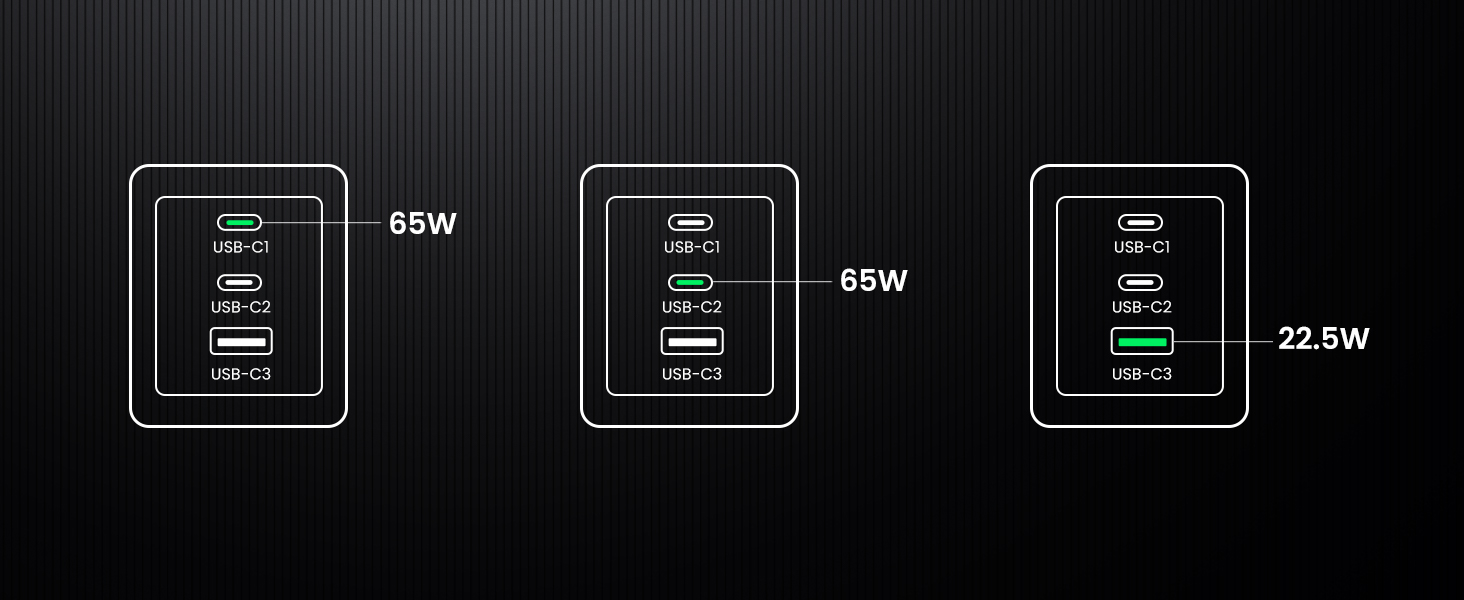 - **สำหรับการเสียบชาร์จพร้อมกันมากกว่า 1 ช่องชาร์จขึ้นไป จะเป็นการจ่ายไฟแบบแบ่งกำลังไฟกันในแต่ละช่องเสียบ โดยรวมแล้วไม่เกินกำลังไฟสูงสุดที่หัวชาร์จทำได้ (65W) ซึ่งรายละเอียดการแบ่งสามารถดูได้จากหัวข้อ “ข้อมูลเชิงเทคนิค” ครับ