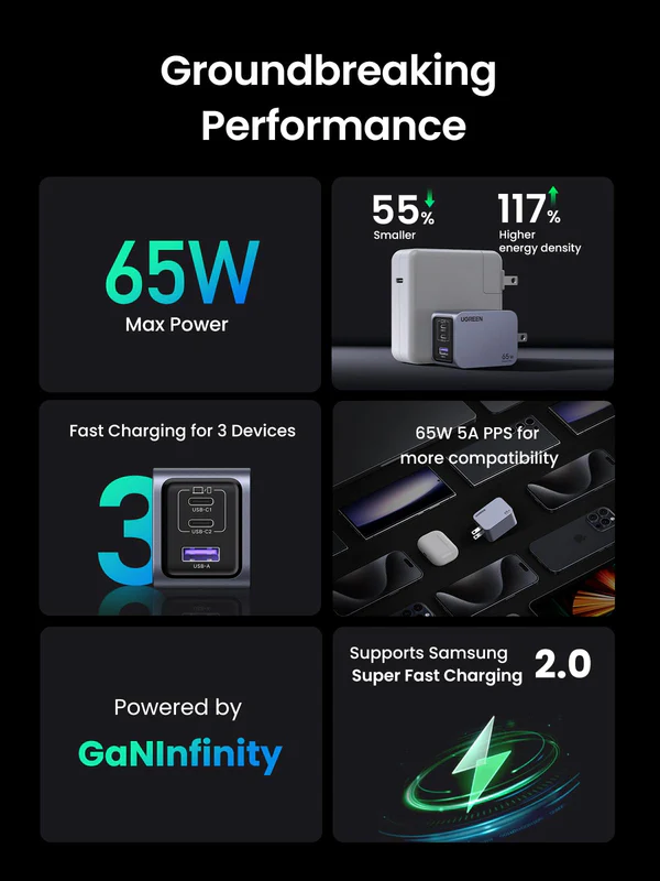 - ขนาดหัวชาร์จมีความเล็กกะทัดรัดลงกว่าหัวชาร์จทั่วไป แต่การจ่ายไฟยังทรงประสิทธิภาพ จากการใช้เทคโนโลยีสารกึ่งตัวนำ GaN (เทคโนโลยี GaNInfinity™)