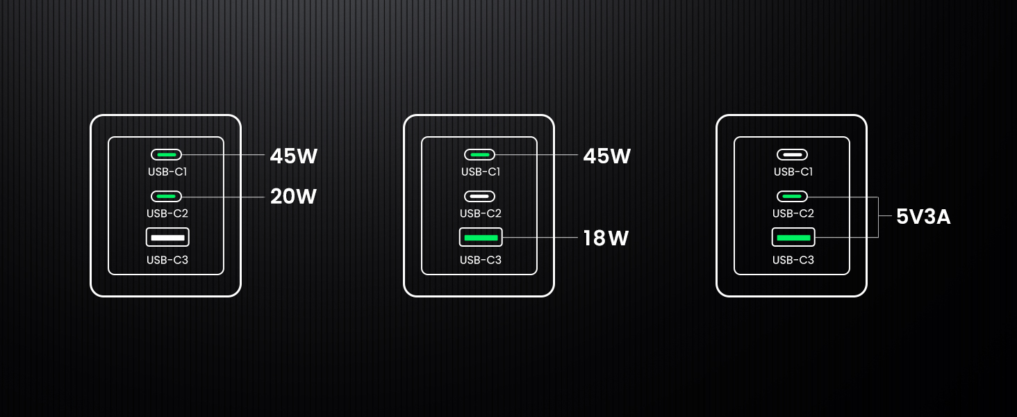 - USB-C2 Output : 5.0V⎓3.0A/9.0V⎓3.0A/12.0V⎓3.0A/15.0V⎓3.0A/20.0V⎓3.25A 65W Max